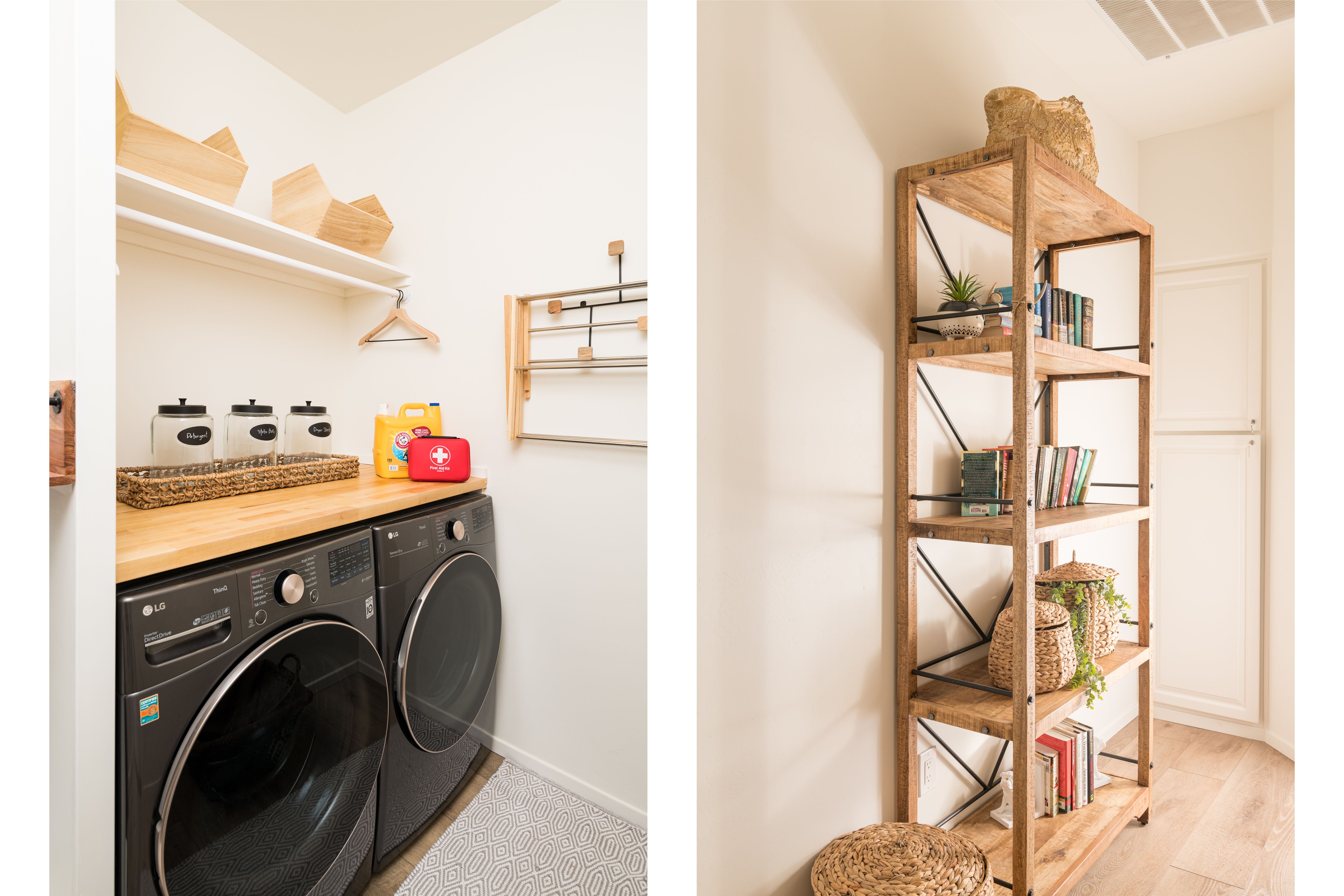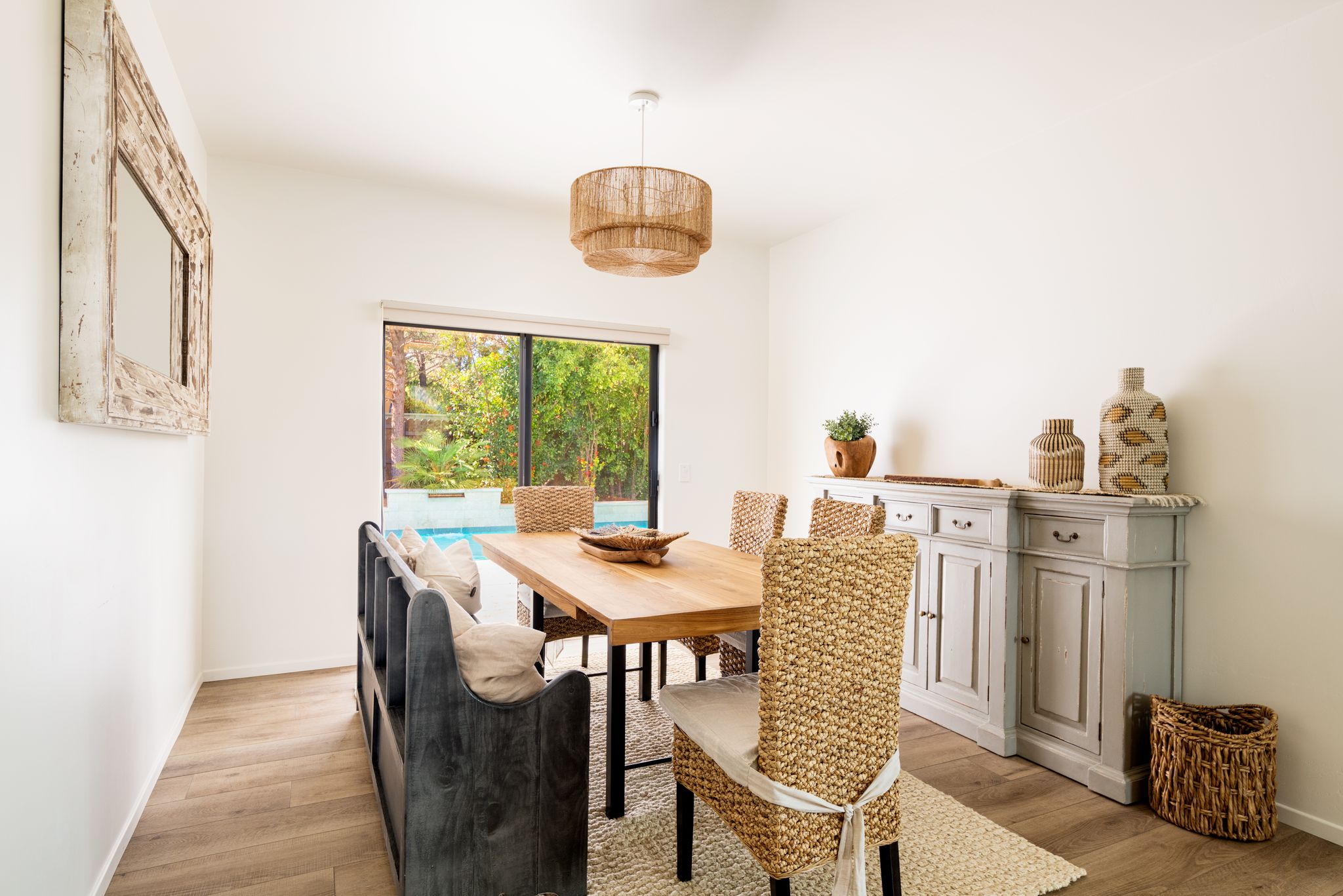 The fully furnished, chef-ready kitchen features all upscale appliances including a 6 burner gas cooktop and oven, coffee bar, refrigerator/freezer, dishwasher, and loads of pantry space! Also includes plenty of spacious seating with a family-sized kitchen island (seating for 4) and a dining table (seating for 7) overlooking the pool waterfall.