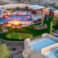 Nestled on over an acre in North Scottsdale, this home was designed for memorable escapes, whether you’re plunging down the pool slide, perfecting your short game on the lit putting green, or gathering around the fire pit under a blanket